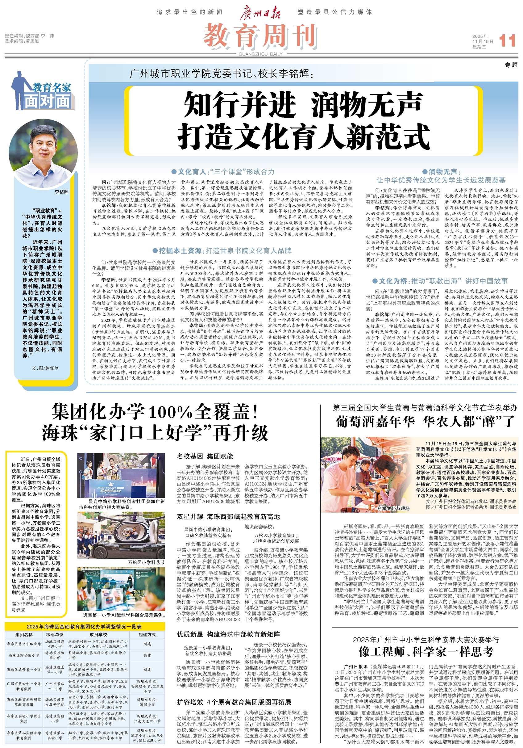 近年来,广州城市职业学院(以下简称广州城职院)深度挖掘本土文化资源,成立中华优秀传统文化传承研究院和甘泉书院,构建起独具特色的文化育人体系,让文化成为滋养学生成长的“精神沃土”。广州城市职业学院党委书记、校长李铭辉说:“职业教育培养的学生,不仅懂技能,同时也懂文化、有涵养。”