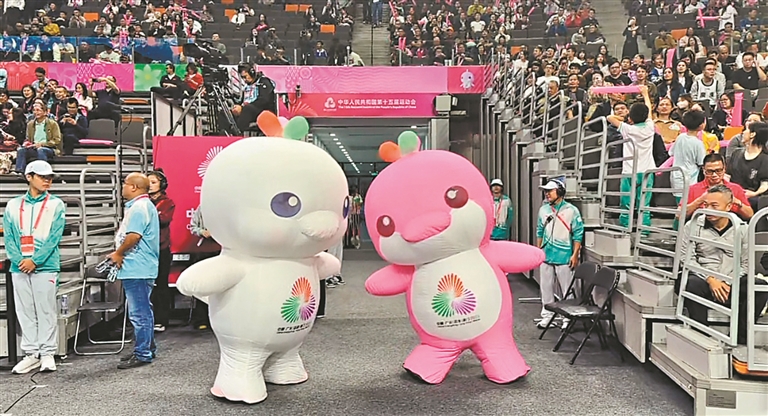 广州日报讯 (全媒体记者马骏、王其琪)第十五届全运会期间,吉祥物“乐融融”与“喜洋洋”两个“显眼包”成功“出圈”,短短10多天在全网播放量已超10亿次,不仅将快乐带给观众,更在网上掀起热潮。近日,在广州赛场演出后,“乐融融”的扮演者——街舞达人刘泽鑫(艺名宏宏)接受本报记者采访时表示:“最开心的是把快乐带给大家。”