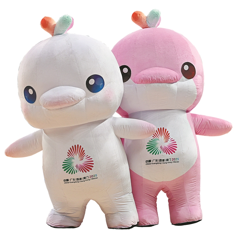 十五运会吉祥物“喜洋洋”和“乐融融”是萌萌的小海豚,头上顶着三朵小水花,代表着粤港澳三地,被网友称赞“可爱到发芽”。其原型本是中华白海豚,却意外以“大湾鸡”的昵称火爆出圈,成为全网“顶流”。“大湾鸡”的热度不断攀升,据悉,“大湾区制造”的“喜乐融融”目前已经上市了涵盖20大类2800余款十五运会和残特奥会特许产品,总额突破6.8亿元人民币,全新预售也正在展开。