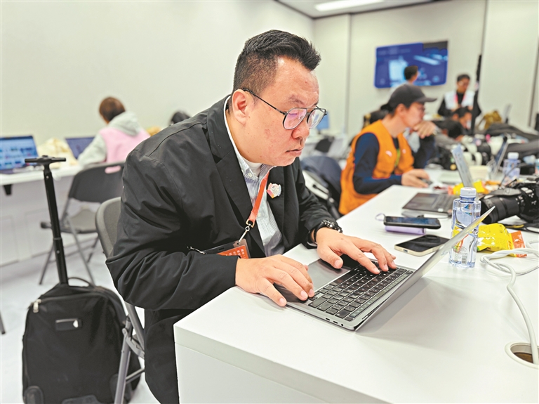 赛场外,我的同事们也在书写着另一种拼搏。王纳、轩慧和我组成的采访小分队,从火炬传递前就全面进入“十五运时间”,开启7×24小时连轴转模式。凌晨1时刚从羽毛球赛场撤离,清晨4时又要奔赴跨境马拉松起点。前后方采编人员默契配合,前方的记者工作到多晚,后方的编辑就陪着工作到多晚。我们的工作群因这份坚韧被冠以“钢铁”之名,热门赛事的爆款作品频出,正是这份辛劳的最好见证。