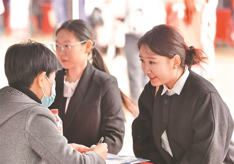 在招聘会现场,企业求贤若渴,纷纷拿出“安居补贴”“创业扶持”等政策,吸引人才“孔雀东南飞”。