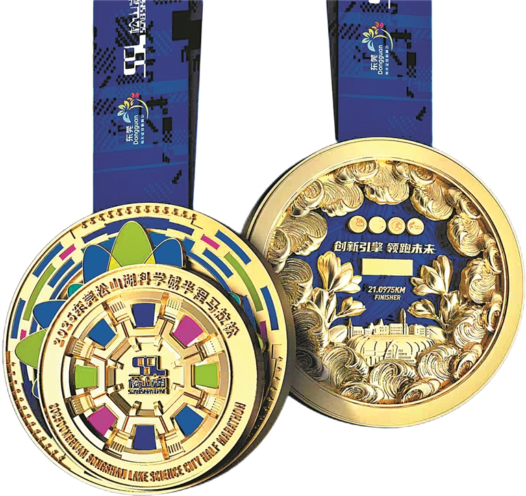 完赛奖牌正面通过双层环结构诠释科技内核,彩色大环以灵动缤纷的科技线条,具象化松山湖蓬勃的创新生态与发展活力。双环间以可旋转的中国散裂中子源部件元素致敬这一“国之重器”,也象征科学探索与运动精神的动态共生。奖牌用手机碰一碰即可呈现松山湖宣传视频。