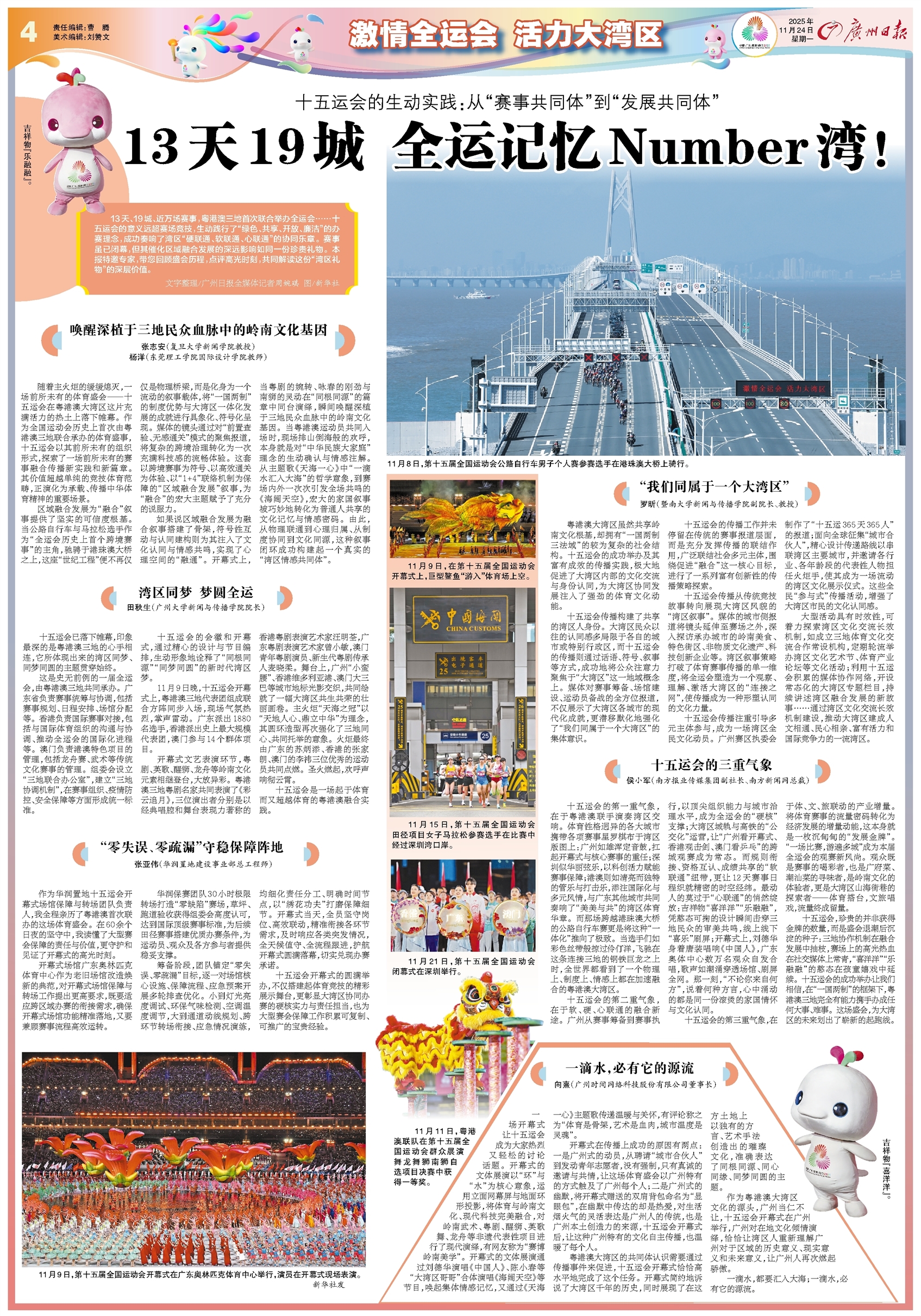 13天、19城、近万场赛事,粤港澳三地首次联合举办全运会……十五运会的意义远超赛场竞技,生动践行了“绿色、共享、开放、廉洁”的办赛理念,成功奏响了湾区“硬联通、软联通、心联通”的协同乐章。赛事虽