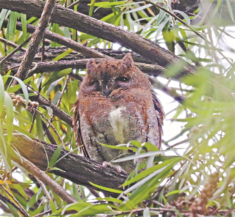 ●“暗夜精灵”红角鸮是自带隐身术的“除害小能手”。它体形小巧玲珑,体长仅20—25厘米,体重约100—150克,相当于一个苹果的重量。它双眼大而圆,呈金黄色,瞳孔黑色,在夜间能发出微弱反光,视觉灵敏度是人类的100倍。红角鸮有灰褐色和砖红色两种色型,面盘有微弱的黑色边缘,耳羽簇常为放平状态。它是树干“伪装大师”——羽毛纹理与树皮无缝融合,昼伏夜出,白天躲在树杈间“隐身”,夜间捕食昆虫、鼠类,守护生态平衡。红角鸮又名东方角鸮,是国家二级保护动物,非常怕打扰。它们的栖息地一旦受到干扰,就可能会迁徙到别处。