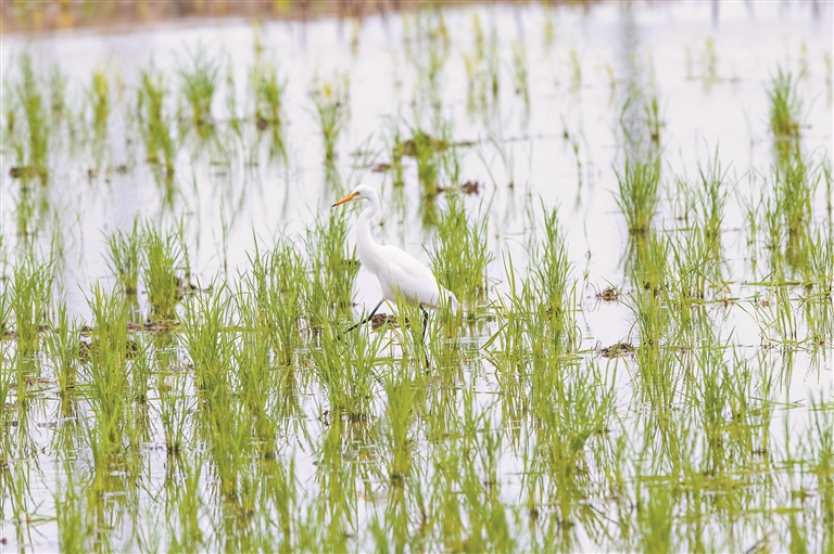 ●“白衣仙子”中白鹭是迷你版的“生态工程师”。中白鹭是大型涉禽,体长52—68厘米,通体雪白、脚黑色,颈呈“S”形。它颈间有矛状“小辫子”。夏羽背及胸部有松软的长丝状羽,喙黑色,短期呈粉红色,脸部裸露皮肤灰色;冬羽喙黄色,尖端黑色,饰羽褪去。中白鹭虹膜黄色,嘴裂不超过眼睛,为本种区别于大白鹭的显著识别特征之一。中白鹭是生态“检测师”——以小鱼、泥鳅、昆虫等为食,其出现与否直接反映湿地生态系统的健康程度。中白鹭通常于浅滩静立觅食,精准捕捉小鱼泥鳅,经常出现在稻田中,偶尔与小白鹭、苍鹭组团“巡湖”。作为“三有”保护动物,中白鹭对栖息地的依赖度让它们成为湿地保护的“晴雨表”,中白鹭的到来,印证了海珠湿地的优质水质和丰富的水生生物资源,是湿地生态良好的直观信号。
