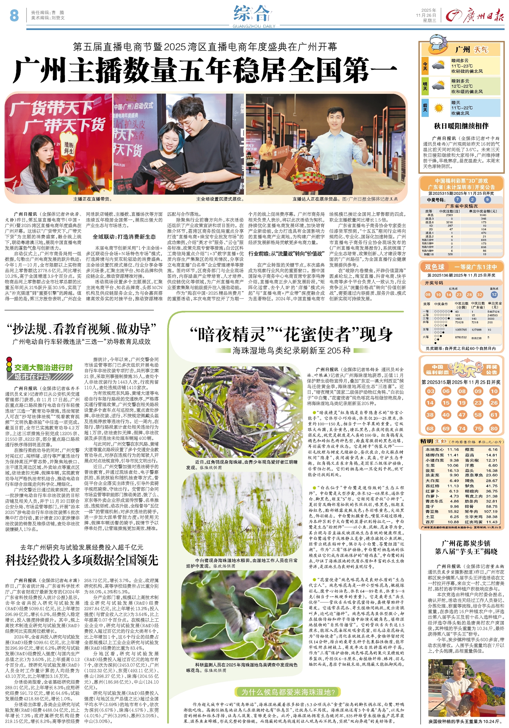 - 广州主播数量五年稳居全国第一 广州日报讯 (全媒体记者许晓芳、文静)昨日,第五届直播电商节(中国・广州)暨2025湾区直播电商年度盛典在广州开幕。这场以“广货带天下,广带天下货”为主题的消费盛宴,融合线上线下,联动粤港澳三地