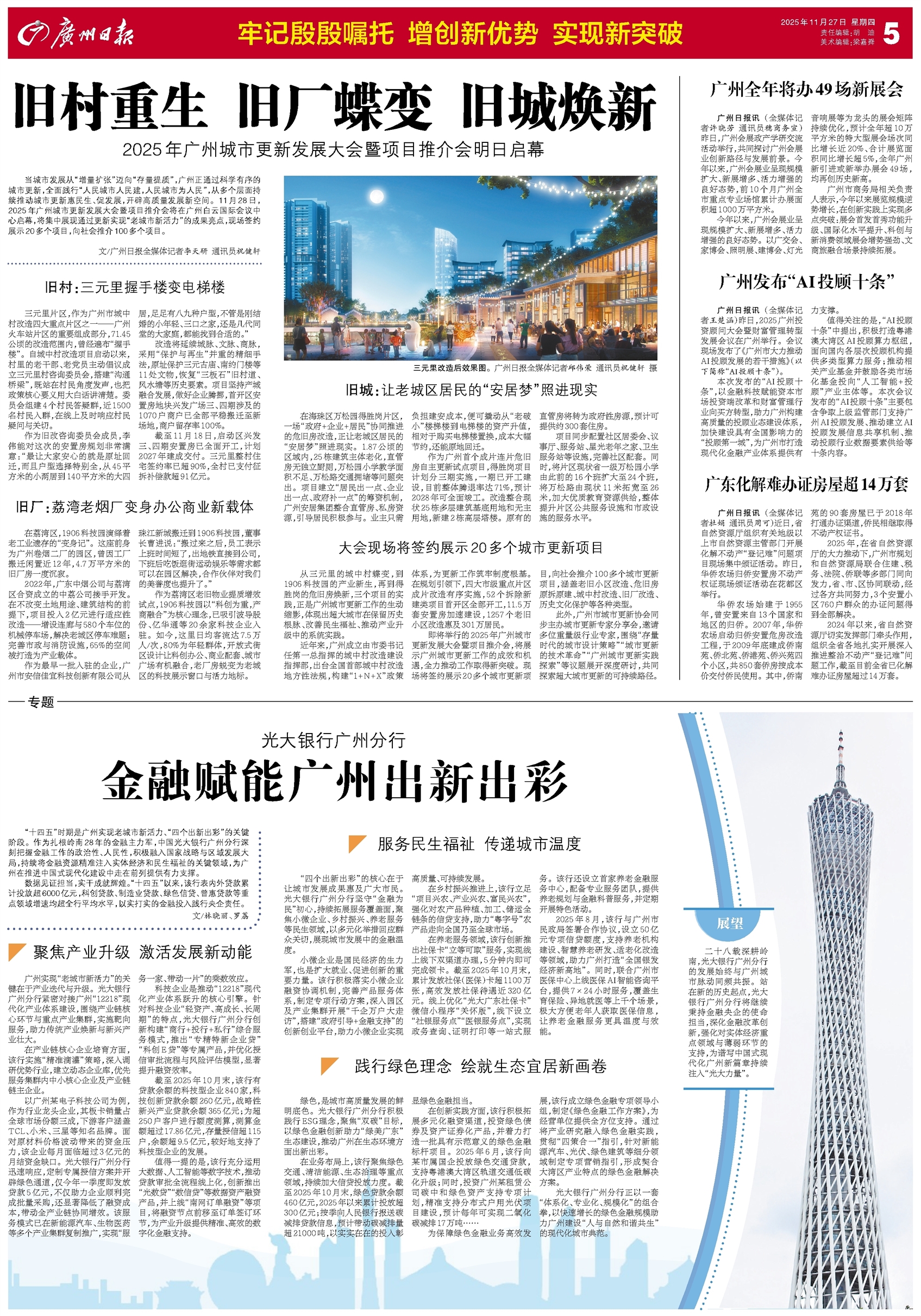 - 光大银行广州分行:金融赋能广州出新出彩 “十四五”时期是广州实现老城市新活力、“四个出新出彩”的关键阶段。作为扎根岭南28年的金融主力军,中国光大银行广州分行深刻把握金融工作的政治性、人民性,积极融入国家战略与区域发展大局,持续将金融资