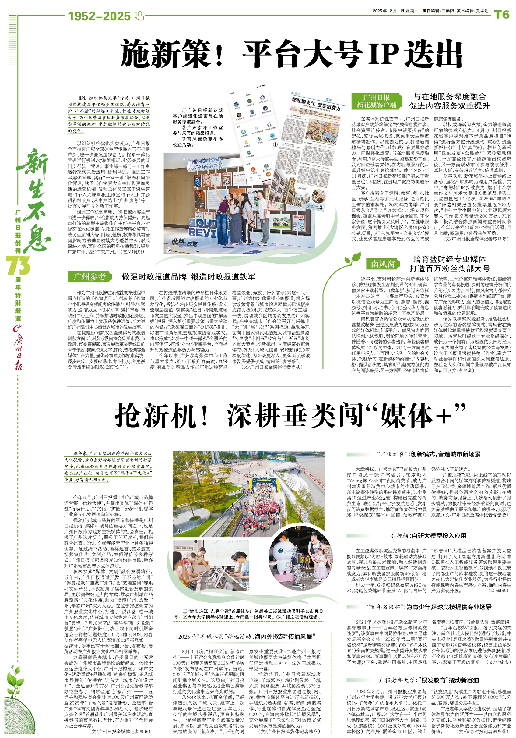 - 施新策!平台大号IP迭出 通过“组织机构变革”行动,广州日报推动构建扁平化轻量化组织,着力培育一批“小而精”的融媒工作室,打造时政财经大号,强化运营与在地服务深度融合,以更加灵活的架构、更加敏捷的身姿应对时代的变化。