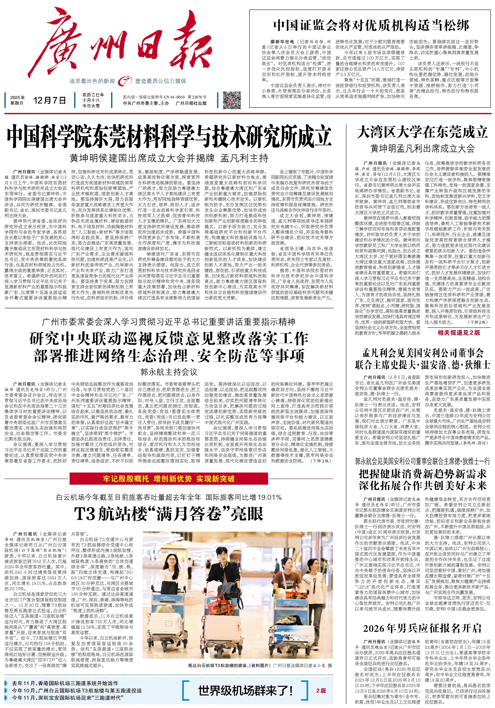 白云机场是国家定位的三大全方位门户复合型国际航空枢纽之一。10月30日,随着T3航站楼及第五跑道正式投运,白云机场迈入“五条跑道+三座航站楼”运行时代,有力推动了大湾区航线网络从“广覆盖”向“高密度、高质量”升级,迎来客流与航线“双丰收”。如今,T3航站楼已平稳运行满月,日均执行158个航班,不仅实现了旅客量的增长,更凭借网红地标出圈、空铁联运升级,为粤港澳大湾区“空中门户”注入全新活力,交出了一份亮眼的“满月答卷”。