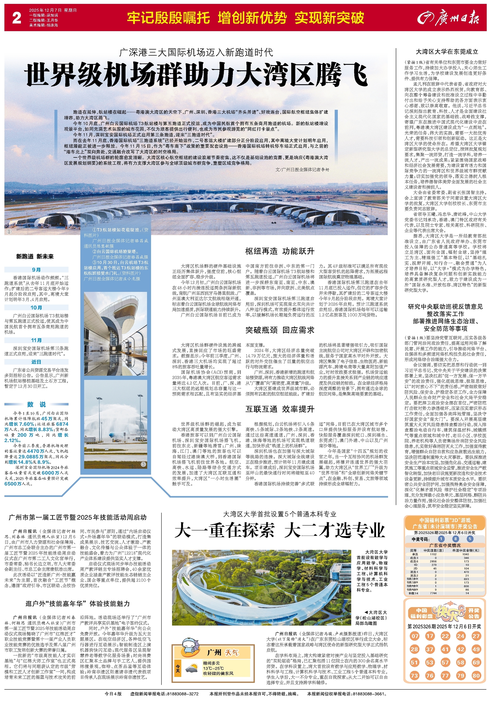 - 世界级机场群助力大湾区腾飞 跑道在延伸,航站楼在崛起……粤港澳大湾区的天空下,广州、深圳、香港三大机场“齐头并进”、好戏连台,国际航空枢纽集体扩建增容,助力大湾区腾飞。 今年10月底,广州白云国际机场T3航站楼与第五跑道