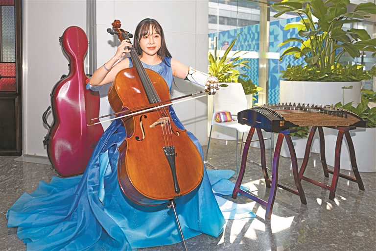黎淑喻说,这款义肢针对演奏需求进行了特殊优化,使她能够自如地操控琴弓。“我非常感恩也很自豪,科技让我在享受便利的同时,更好地表达艺术。”通过更换不同的义肢,黎淑喻可以演奏大提琴、古筝,这让她通过音乐感受到更多的自信和快乐。