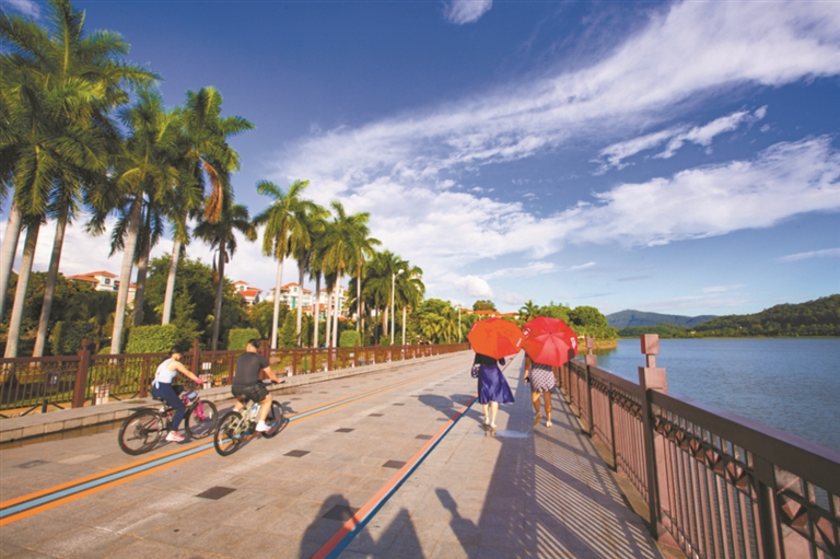当下,骑行是一种贴近自然的旅行方式,也是一场身心舒展的运动。在南城,一条条风景如画的碧道,为你奉上“天花板”级的骑行体验。傍晚,水濂湖公园便展开一幅生动的全民健身长卷:跑者在步道上挥洒汗水,骑手沿车道轻盈掠过,散步的人们则在慢行道上悠闲赏景。全长6.7公里的环湖主园路经改造后,已成为健身休闲的新名片。