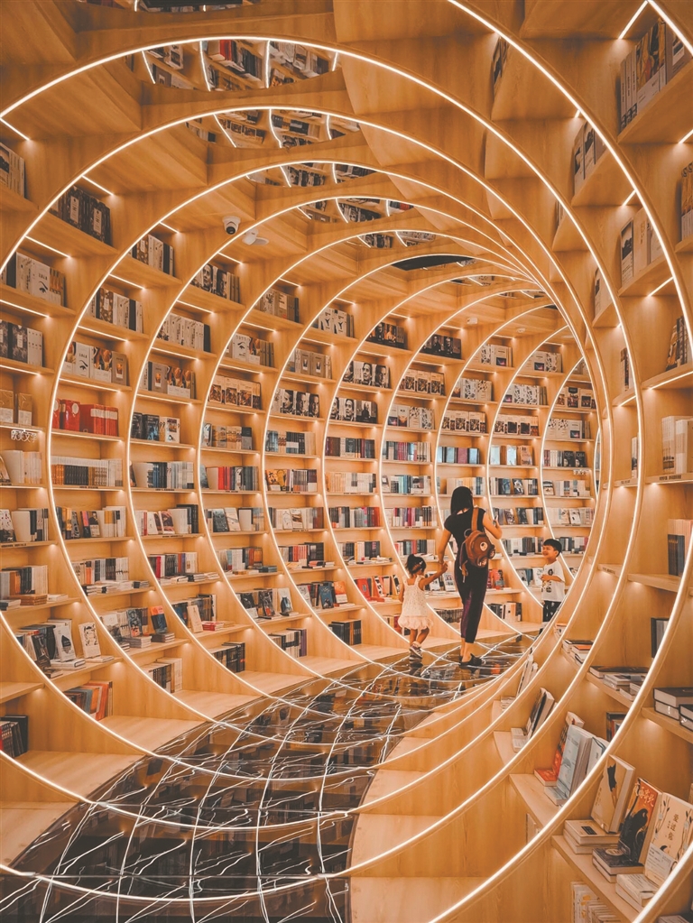 踏入书店,L3层的“时光隧道”便让人惊叹,拱形镜面构筑的环形通道“魔幻”风十足,木质书架与暖色调灯光交织,光影交错间,宛如穿梭于知识年轮。顺着“灵猫阶梯”来到L4层的“镜像星海”,巨型的斐波那契螺旋艺术装置自天花板悬垂而下,像从宇宙里摘来的星云。若是逛累了,不妨移步“梯山仙芽”茶馆,点一壶冷萃茶,捧一本心仪的书,在茶香与书香中,享受一段宁静时光。