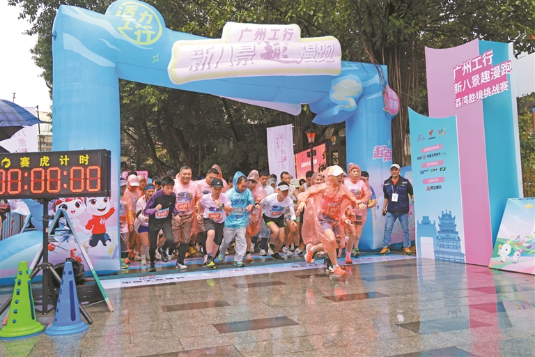 广州日报讯 (全媒体记者林晓丽摄影报道)12月13日,广州工行·新八景“趣”漫跑第三站“荔湾胜境挑战赛”在荔湾湖公园开跑。寒潮携雨而至,却未阻挡参赛者奔跑的热情。在中国花样游泳世界冠军陈晓君、广东广播电视台体育主播任锴两位漫跑大使带动下,千名参赛者热情出发,在冬雨与寒风中共赴一场融全民健身、文化传承与红色教育于一体的城市漫跑。
