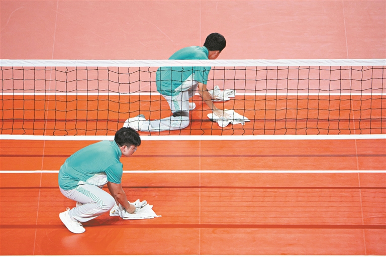 赛场之上,“快擦手”与“滚球妹”守护着比赛的节奏与安全。“快擦手”需在“死球”后至裁判鸣哨前的8秒内,迅速擦拭地面汗渍,一场比赛往返数十次,汗水浸透衣衫也毫无怨言。志愿者邓志乐提前学习手语,以便更好地服务运动员。“滚球妹”李嘉敏等志愿者则化身“球类管家”,仔细擦干每一个球后再传递给运动员,从运动员身上汲取拼搏力量。
