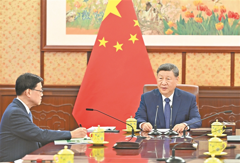 习近平指出,中国共产党二十届四中全会对“十五五”时期国家经济社会发展作出战略擘画,强调要坚定不移贯彻“一国两制”、“港人治港”、高度自治方针,促进香港长期繁荣稳定。特别行政区政府要主动对接国家“十五五”规划,坚持和完善行政主导,扎实推动经济高质量发展,深度参与粤港澳大湾区建设,更好融入和服务国家发展大局。