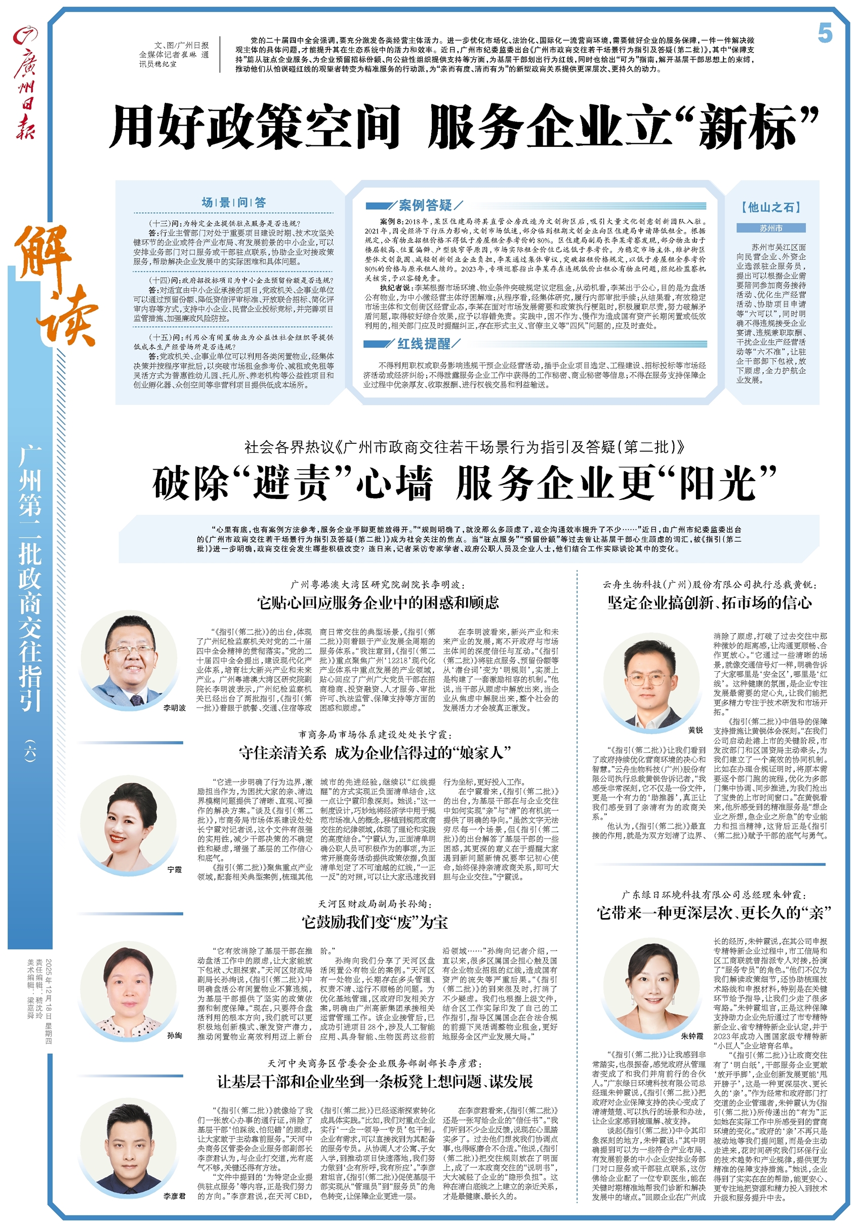 - 破除“避责”心墙 服务企业更“阳光” “心里有底,也有案例方法参考,服务企业手脚更能放得开。”“规则明确了,就没那么多顾虑了,政企沟通效率提升了不少……”近日,由广州市纪委监委出台的《广州市政商交往若干场景行为指引及答疑(第二批)》
