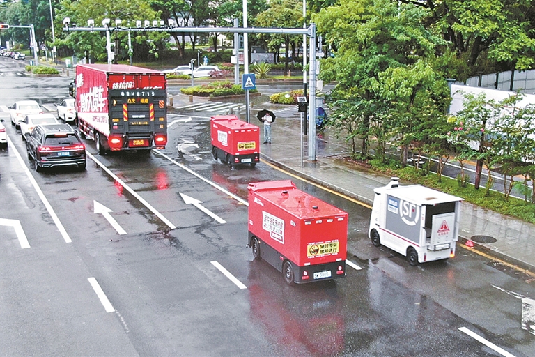 事实上,无论是在路上、地铁站还是机场,深圳市民经常能看到无人车“忙碌”的身影,智慧物流配送已真正深入城市的毛细血管,实现场景化实用落地。记者在福田华强北商圈采访了解到,通过创新探索“轨道交通+无人配送”新模式,商圈物流效率提升了30%以上。以日均发件超600件的大客户场景为例,传统人工模式从备货到出发需30分钟以上,引入无人车后通过“预装货、送完即回”循环模式,该环节压缩至10分钟内。