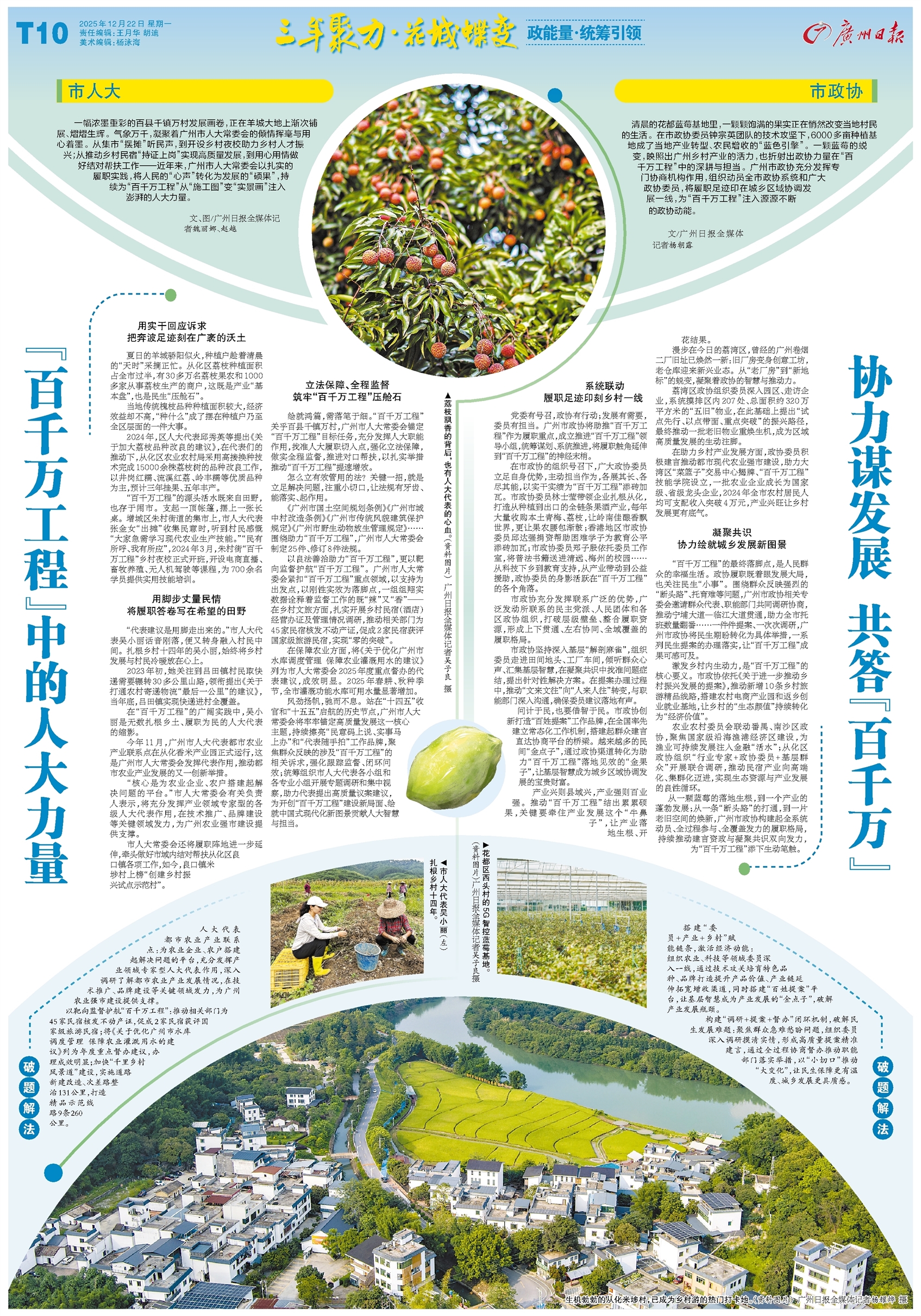 - 市人大:“百千万工程”中的人大力量 一幅浓墨重彩的百县千镇万村发展画卷,正在羊城大地上渐次铺展、熠熠生辉。气象万千,凝聚着广州市人大常委会的倾情挥毫与用心着墨。从集市“摆摊”听民声,到开设乡村夜校助力乡村人才振兴;从推动乡村民宿“
