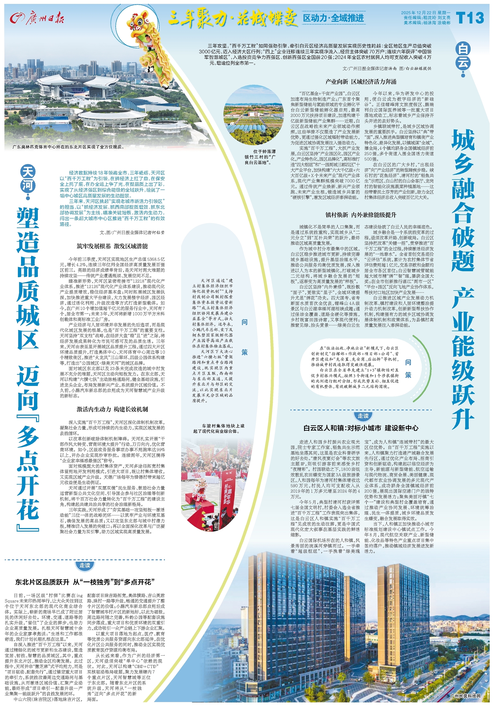 - 白云:城乡融合破题 产业能级跃升 三年攻坚,“百千万工程”如同强劲引擎,牵引白云区经济高质量发展实现历史性跨越:全区地区生产总值突破3000亿元,迈入经济大区行列;“四上”企业迁移连续三年实现净流入,经营主体突破70万户;连续六年