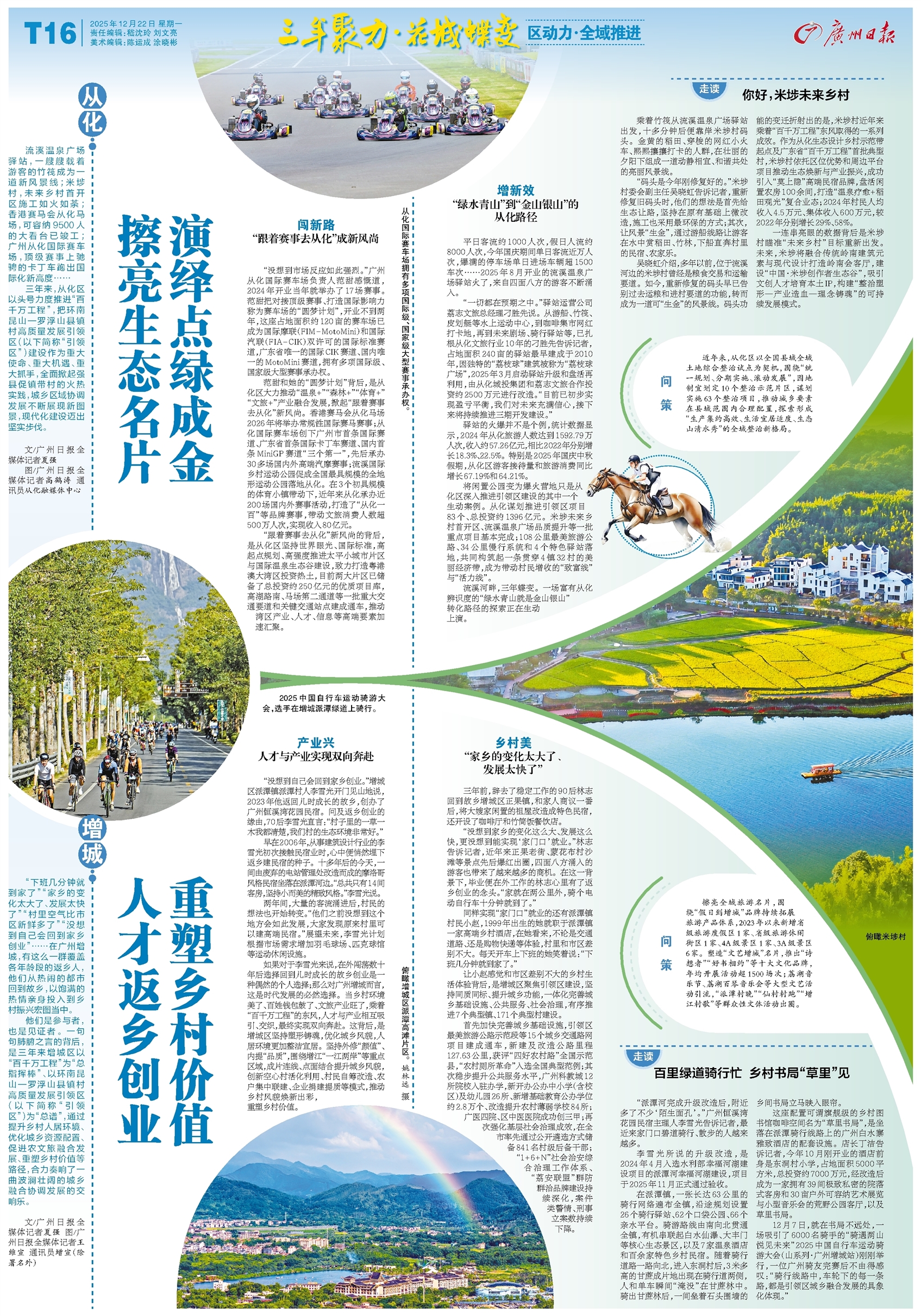 - 从化:擦亮生态名片 演绎点绿成金 流溪温泉广场驿站,一艘艘载着游客的竹筏成为一道新风景线;米埗村,未来乡村首开区施工如火如荼;香港赛马会从化马场,可容纳9500人的大看台已竣工;广州从化国际赛车场,顶级赛事上驰骋的卡丁车跑出国际化