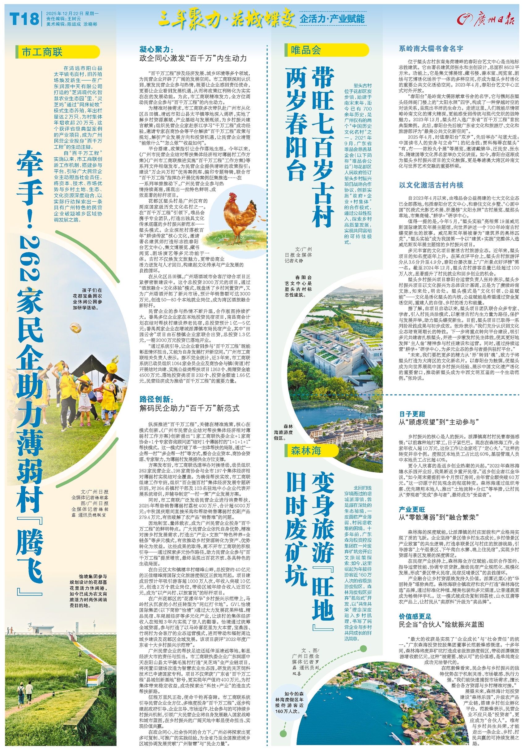 - 市工商联:牵手!262家民企助力薄弱村“腾飞” 在清远市阳山县太平镇毛崀村,旧养殖场焕发新生——在广东润源中天有限公司打造的“芝清现代化智慧农业生态园”里,“灵芝鸡”通过“网床轮牧”模式生态养殖,年出栏量达2万只,为村集体年增收超20万元,这个