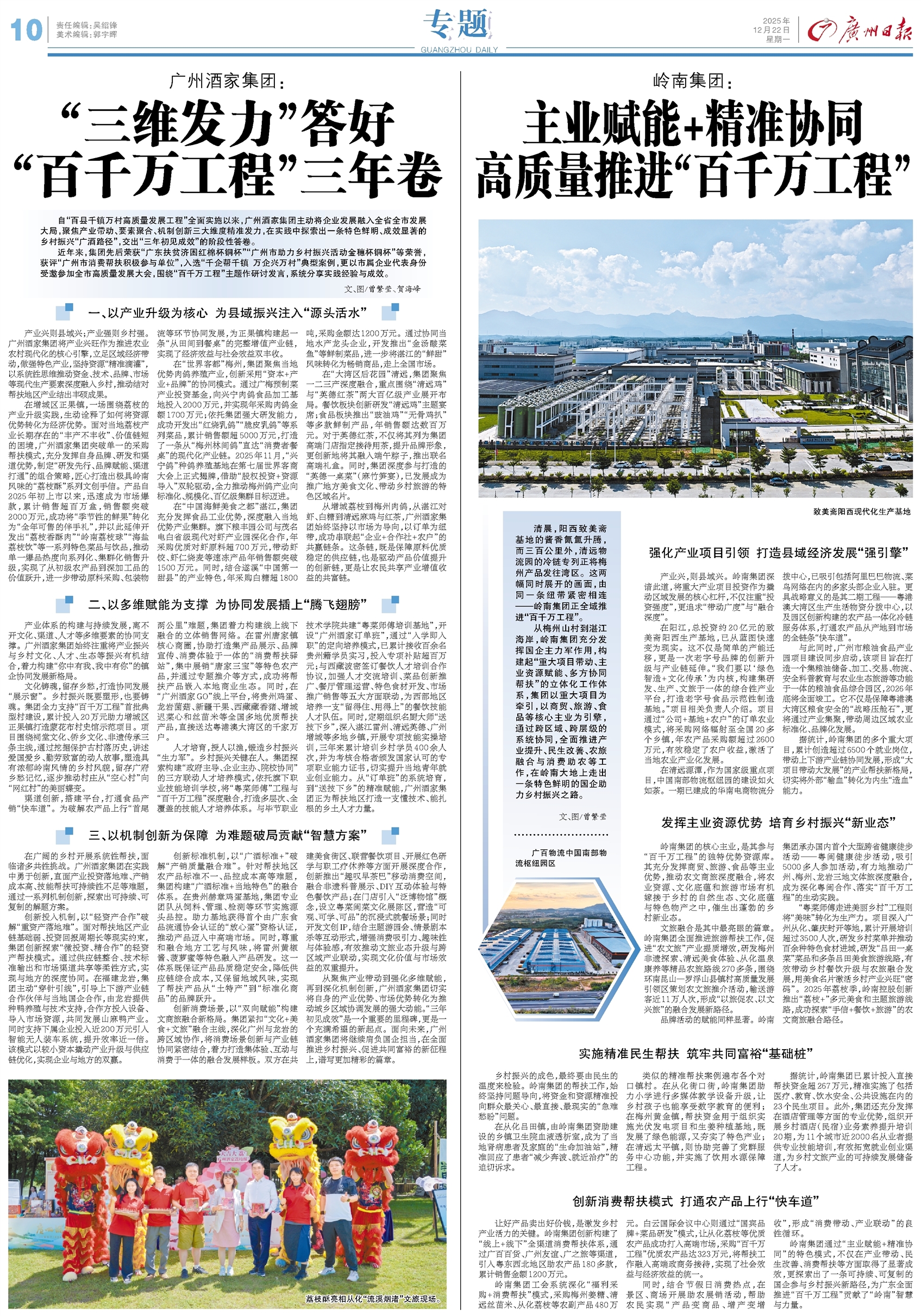 - “三维发力”答好 “百千万工程”三年卷 自“百县千镇万村高质量发展工程”全面实施以来,广州酒家集团主动将企业发展融入全省全市发展大局,聚焦产业带动、要素聚合、机制创新三大维度精准发力,在实践中探索出一条特色鲜明、成效显著的乡村振兴“广酒