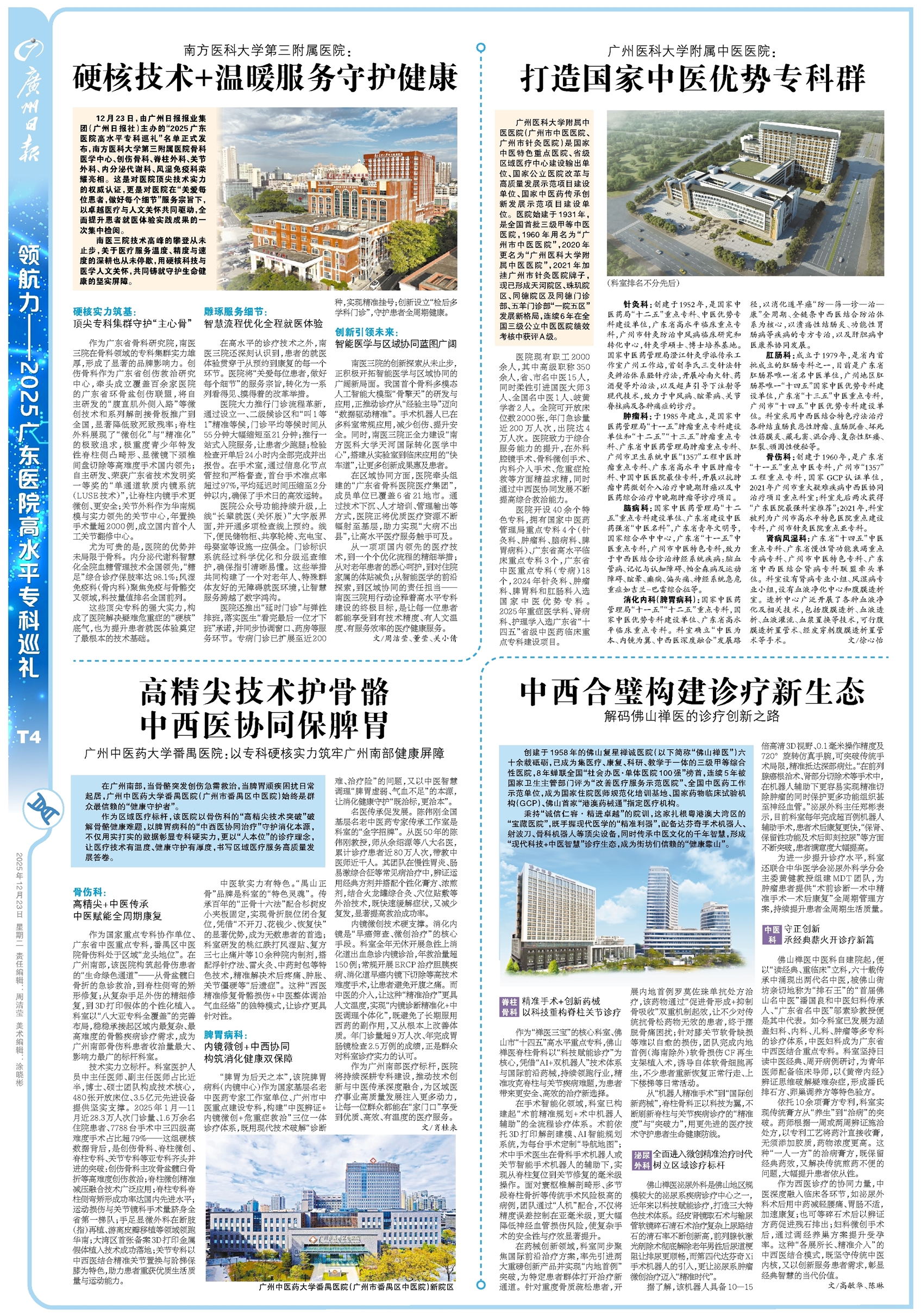 - 硬核技术+温暖服务守护健康 12月23日,由广州日报报业集团(广州日报社)主办的“2025广东医院高水平专科巡礼”名单正式发布,南方医科大学第三附属医院骨科医学中心、创伤骨科、脊柱外科、关节外科、内分泌代谢科、风湿免疫科荣