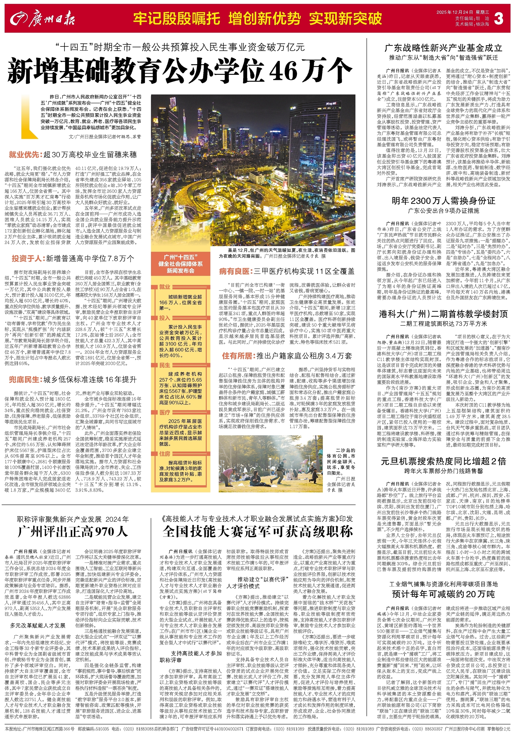 - 新增基础教育公办学位46万个 昨日,广州市人民政府新闻办公室召开“‘十四五’广州成就”系列发布会——广州“十四五”健全社会保障体系新闻发布会。记者在会上获悉,“十四五”时期全市一般公共预算累计投入民生事业资金突破一万亿元,教育