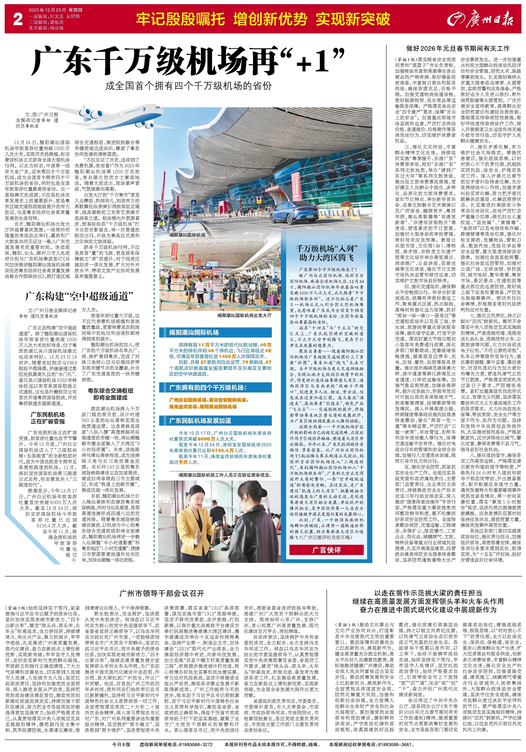 - 广东构建“空中超级通道” 文/广州日报全媒体记者李妍 通讯员粤机宣 广东正在构建“空中超级通道”。除了揭阳潮汕国际机场年旅客吞吐量突破1000万人次大关的好消息,位于粤西的湛江吴川国际机场最近也迎来利好。12月23日1