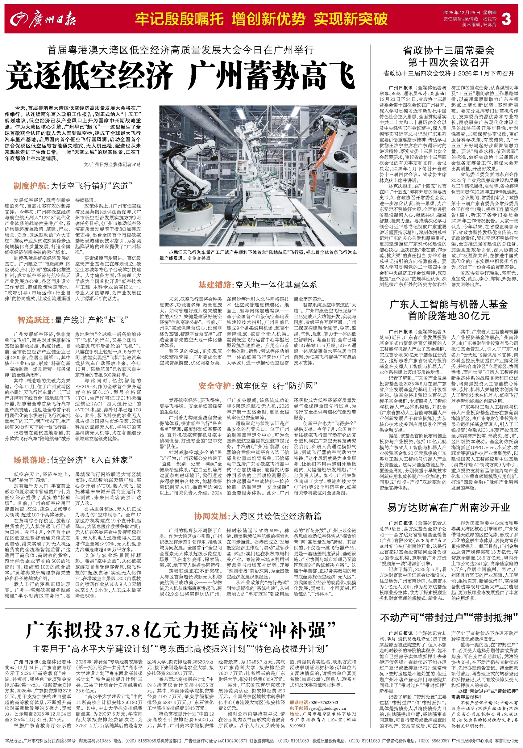 - 竞逐低空经济 广州蓄势高飞 今天,首届粤港澳大湾区低空经济高质量发展大会将在广州举行。从连续两年写入政府工作报告,到正式纳入“十五五”规划建议,低空经济已从产业风口上升为国家中长期战略重点。作为大湾区核心引擎,广州早已“起飞