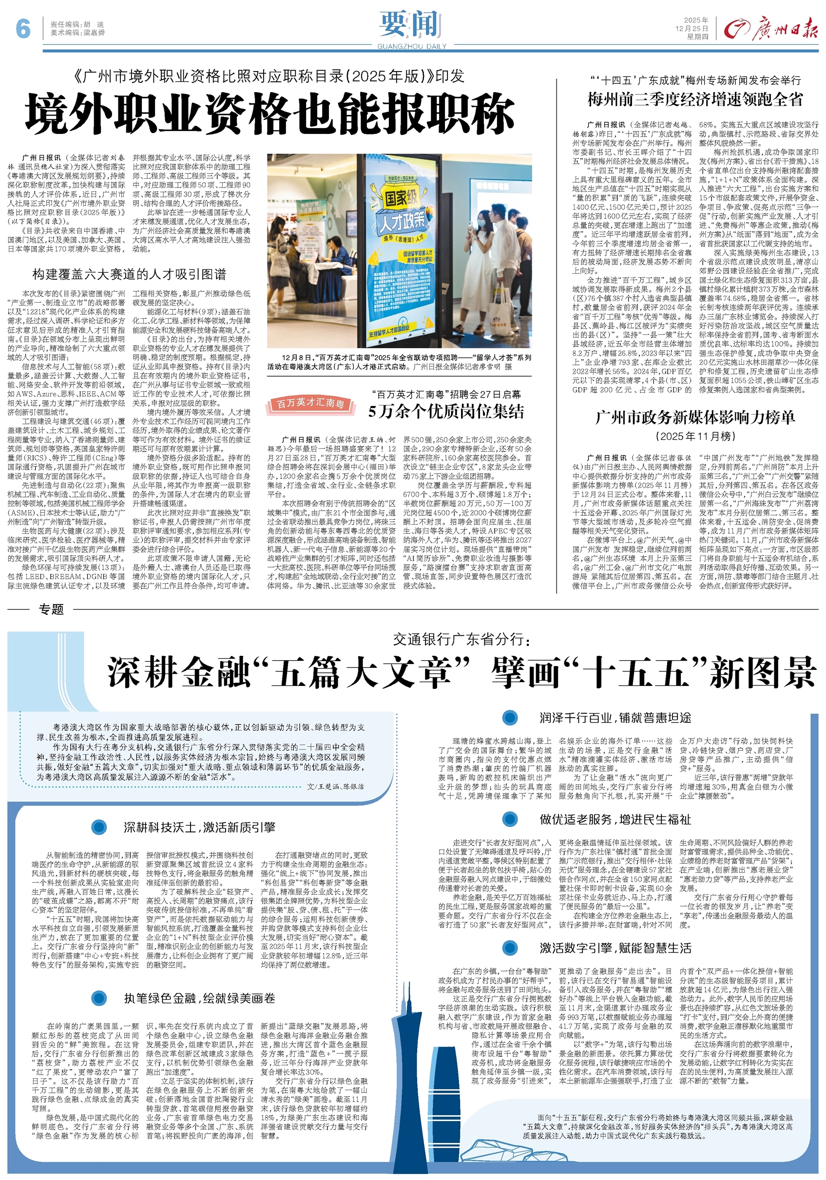 - 交通银行广东省分行:深耕金融“五篇大文章” 擘画“十五五”新图景 粤港澳大湾区作为国家重大战略部署的核心载体,正以创新驱动为引领、绿色转型为支撑、民生改善为根本,全面推进高质量发展进程。 作为国有大行在粤分支机构,交通银行广东省分行深入贯彻落实党的二十届四中