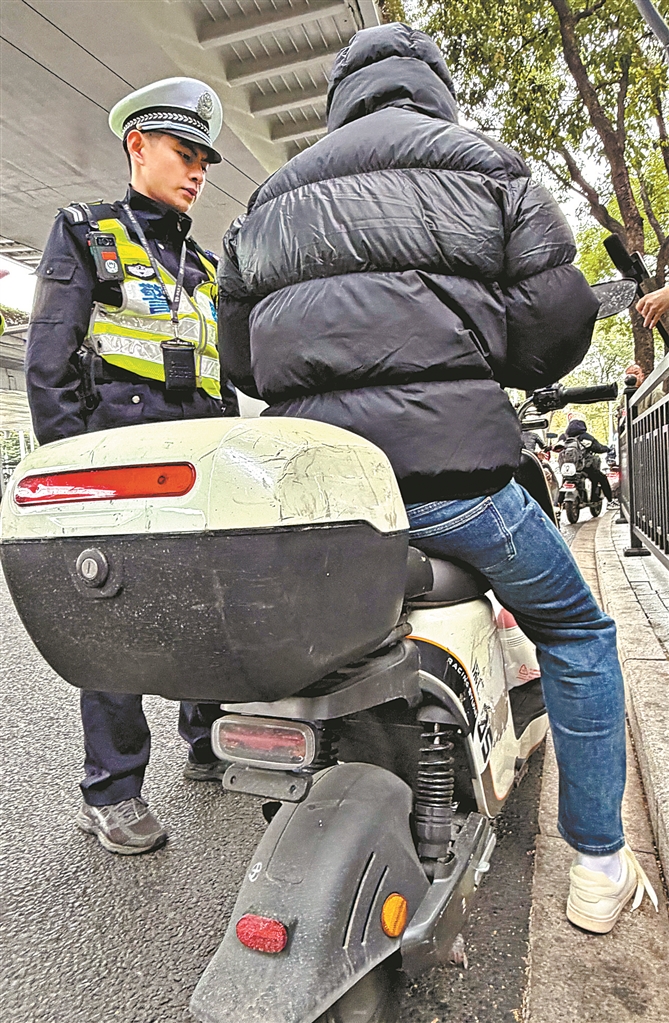 广州日报讯 (全媒体记者张丹羊)“头盔带了,但戴着不舒服就没戴”“卖车的店家说包上牌,我就买了(外地号牌)”……12月26日,在位于广州市越秀区大北立交附近的电动自行车整治点,多名骑行者因交通违法行为被执勤交警依法处罚。