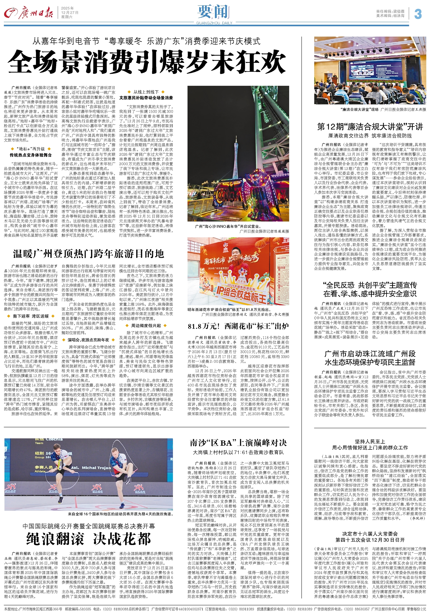 - 绳浪翻滚 决战花都 广州日报讯 (全媒体记者董业衡 通讯员谢惠瑜、蔡剑豪、李八一摄影报道)12月26日,伴随着激昂的鼓点与摇晃的彩绳,中国体育彩票2025年中国国际跳绳公开赛暨全国跳绳联赛总决赛开幕式在广州市花都区东