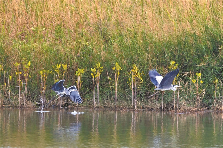 清晨7时许,在南沙万顷沙镇二十涌附近,候鸟三五成群,或沿水边缓步觅食,或静立榕树枝头,或低飞掠过水面,构成一幅生机盎然的生态图景。