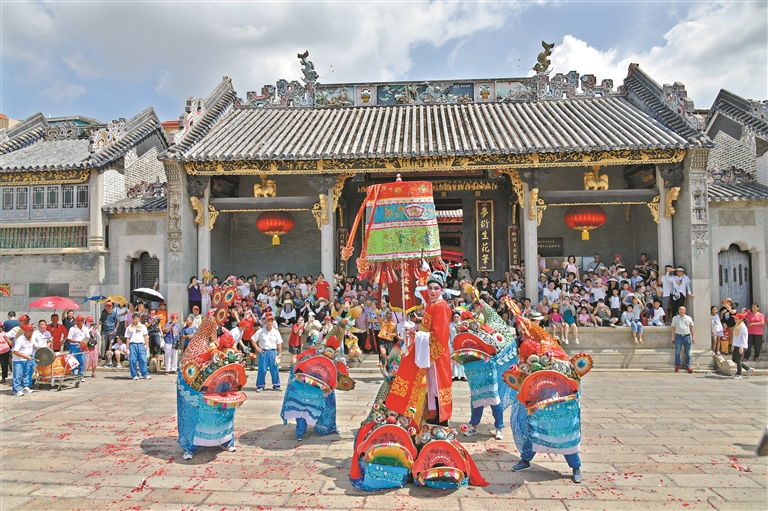 陈家祠、镇海楼、五仙观等广州地标建筑的屋脊上,鳌鱼造型灵动,给古朴的建筑平添几分生趣;三月三广州民间北帝诞,飘色巡游队伍中,鳌鱼舞动,锣鼓喧天。有学者表示,鳌鱼并非“鱼”,而是源自古代神话故事中的“龟”,自唐宋随儒学传入岭南,并与当地文化融合。