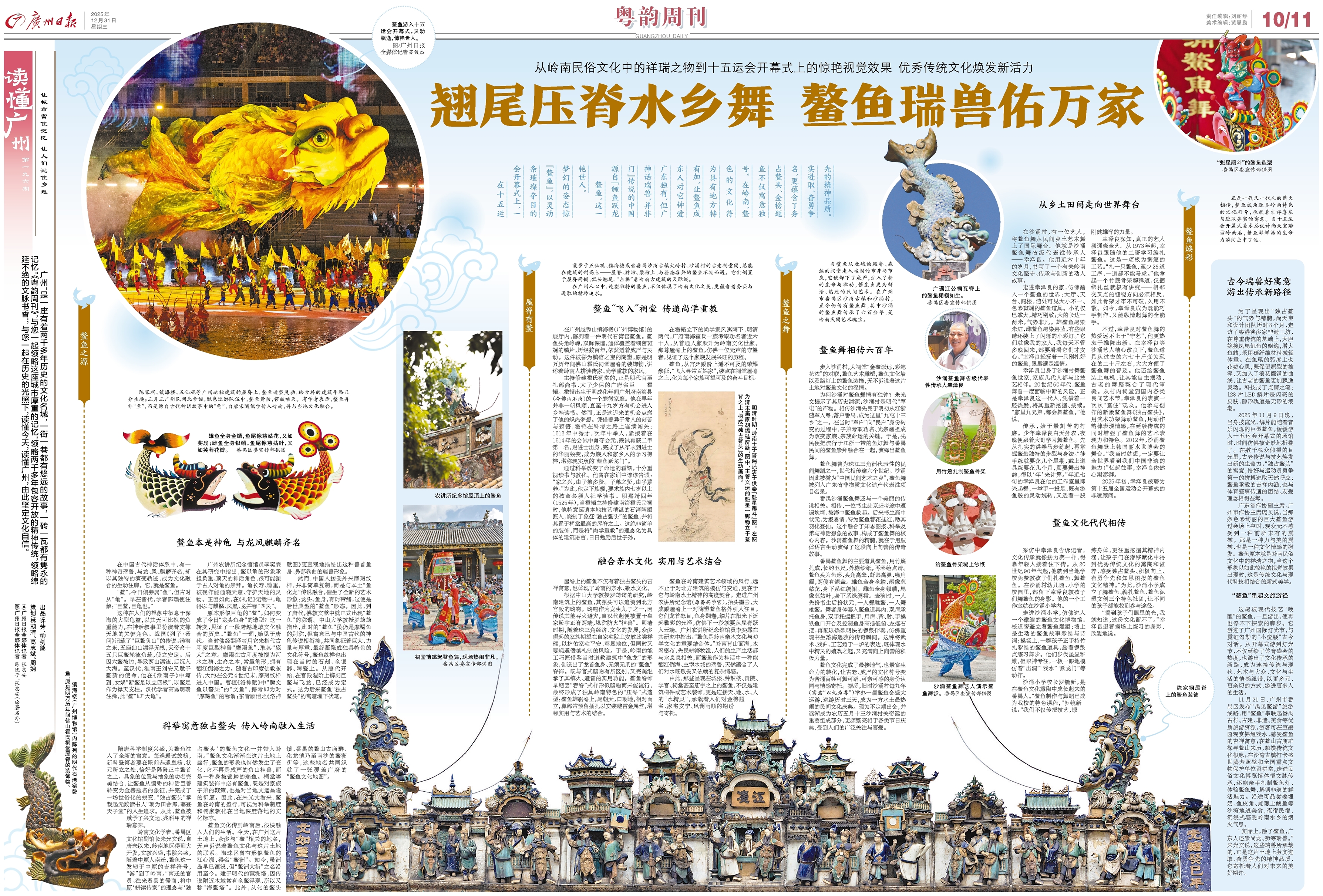 正是一代又一代人的薪火相传,鳌鱼成为独具岭南特色的文化符号,承载着吉祥喜庆与进取务实的寓意。当十五运会开幕式美术总设计尚天宝踏访岭南后,鳌鱼那鲜活的生命力瞬间击中了他。