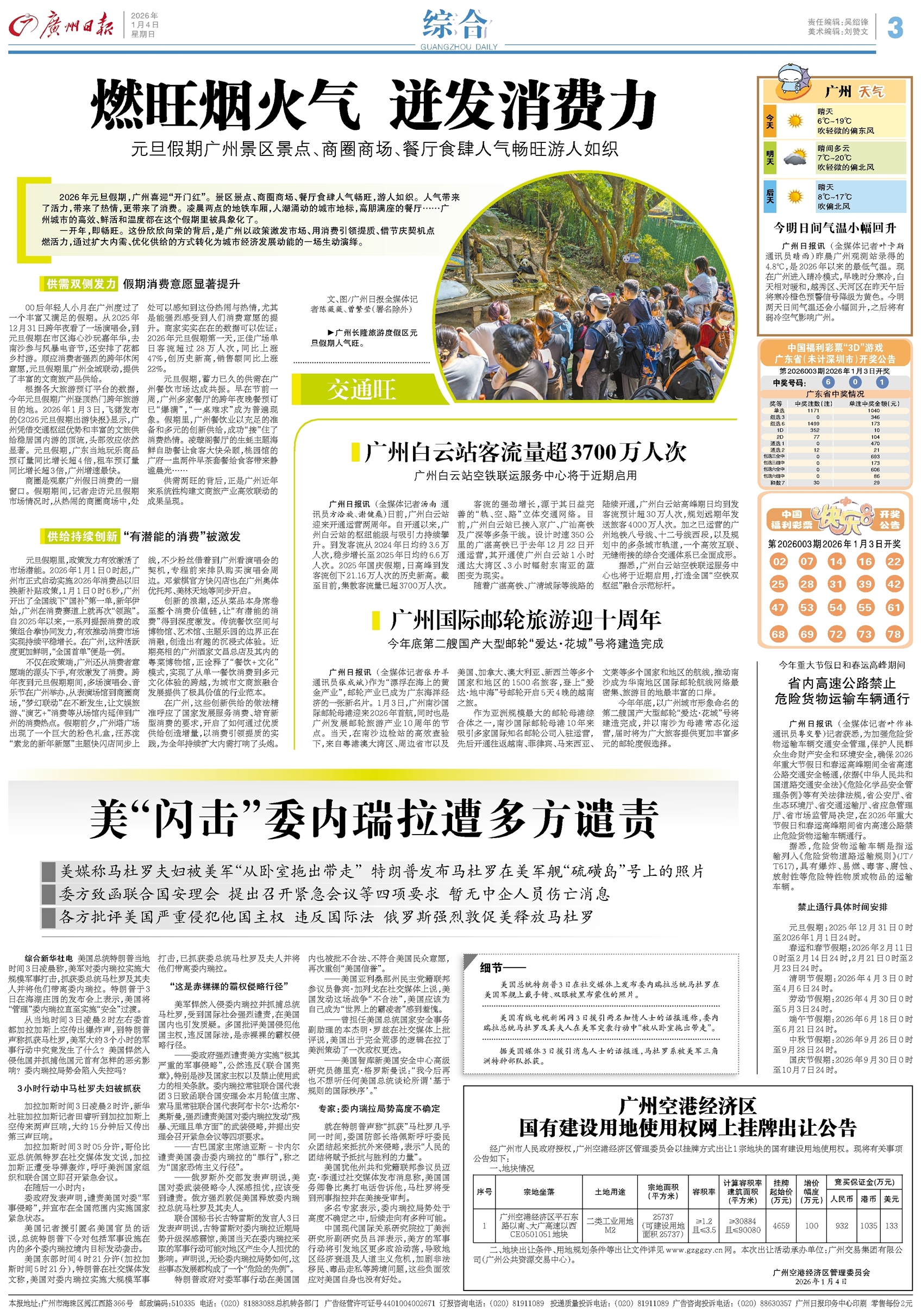 - 燃旺烟火气 迸发消费力 2026年元旦假期,广州喜迎“开门红”。景区景点、商圈商场、餐厅食肆人气畅旺,游人如织。人气带来了活力,带来了热情,更带来了消费。凌晨两点的地铁车厢,人潮涌动的城市地标,高朋满座的餐厅……广州城市