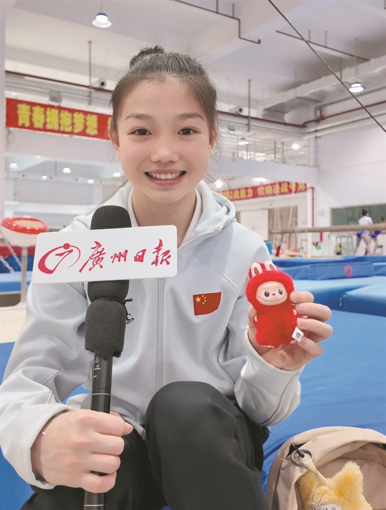 跟很多小运动员一样,柯沁沁也是一个“娃娃控”,她的书包上也挂满了小玩偶。她逐一向记者介绍了那些小玩偶的名字,很多都是抽出来的盲盒。在十五运会上拿到了好成绩,爸爸妈妈奖励给她的也是盲盒。“他们送了我‘宝拉’。”柯沁沁展示着书包上C位的一个小玩偶告诉记者。对于十五运会吉祥物盲盒,她如数家珍,但是都舍不得挂在书包上,因为担心会弄脏。记者问她为什么书包上没有挂拉布布。她笑着说:“还没有抽到呢。”于是,我们送她一只红色的拉布布。柯沁沁特别开心,马上挂在书包上,和“宝拉”做伴。“谢谢大家对我的关心,教练和辅助人员对我的鼓励和帮助,是你们的帮助和鼓励,我才有了今天的成绩。接下来,在冬训中,我会提高自己的难度,希望能够在2026年的世界赛场上锻炼自己。”柯沁沁说。