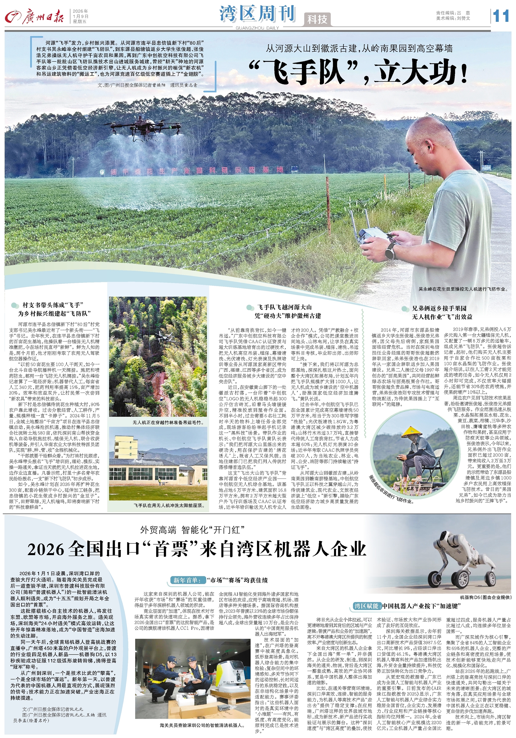 - “飞手队”,立大功! 河源“飞手”发力,乡村振兴添翼。从河源市连平县忠信镇新下村“80后”村支书吴永峰率全村组建“飞防队”,到东源县船塘镇返乡大学生张俊超、张俊浩兄弟操纵无人机守护千亩农田和果园,再到广东中创航空科技有