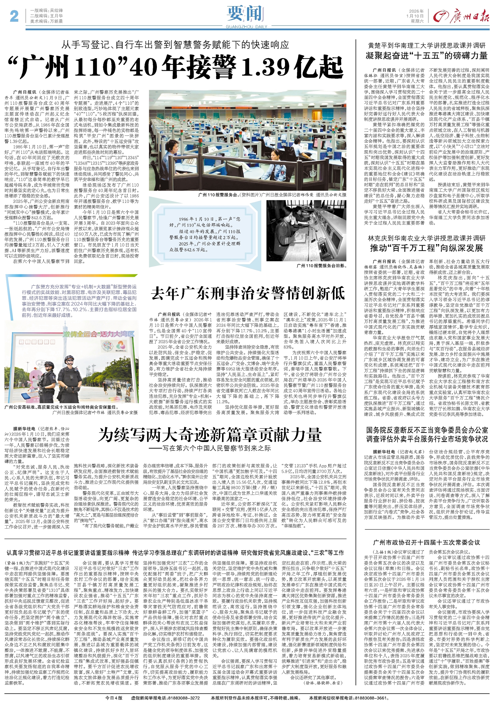 - 去年广东刑事治安警情创新低 广州日报讯 (全媒体记者叶作林 通讯员粤公宣) 2026年1月10日是第六个中国人民警察节,也是全国第40个“110宣传日”。节日前夕,省公安厅全面通报了2025年全省公安工作情况。 2