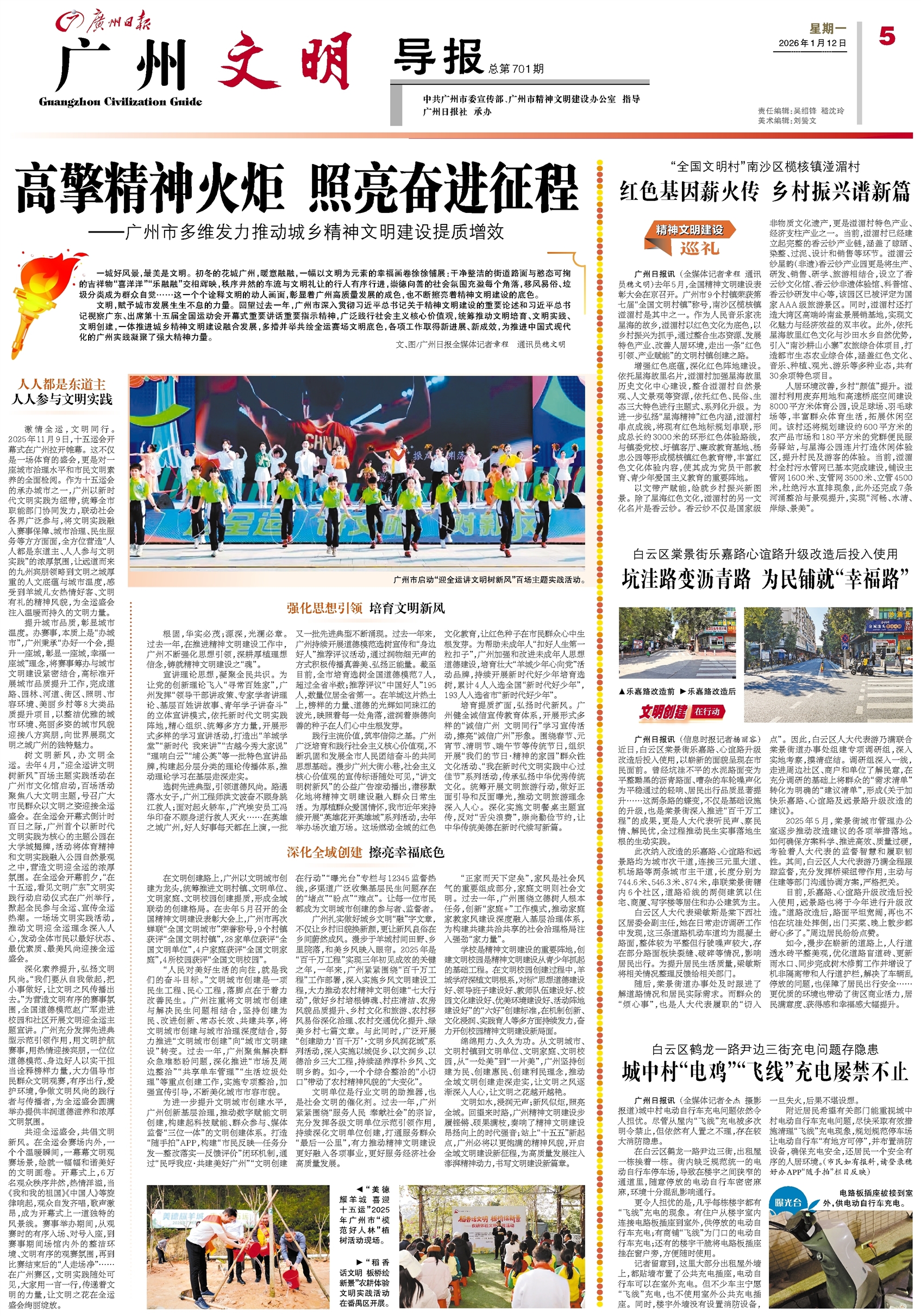 - 高擎精神火炬 照亮奋进征程 一城好风景,最美是文明。初冬的花城广州,暖意融融,一幅以文明为元素的幸福画卷徐徐铺展:干净整洁的街道路面与憨态可掬的吉祥物“喜洋洋”“乐融融”交相辉映,秩序井然的车流与文明礼让的行人有序行进,崇德