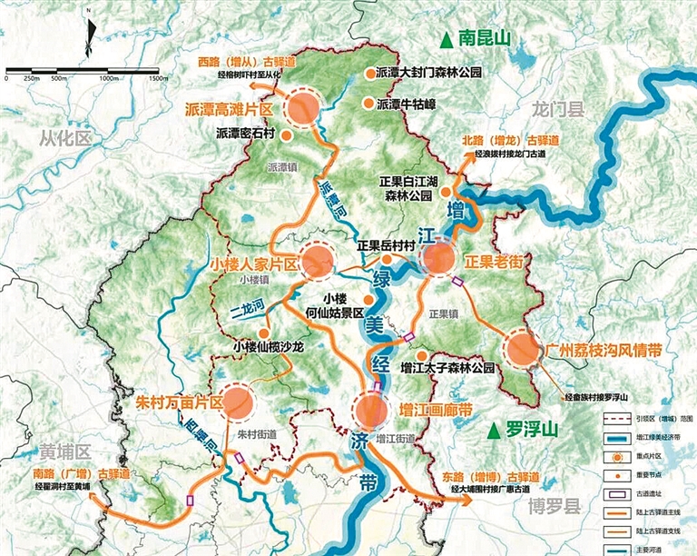 六大重点片区,派潭高滩片区以“国际乐谷·健康派潭”为主题,打造乐山乐水温泉谷、生态康健活力源、乡村文化展演地;正果老街片区以“鱼跃龙门·修成正果”为主题,建设增江文旅联动区、正果文化体验区、食在广东代表地;广州荔枝沟风情带以“罗浮后山·幽谷探源”为主题,打造荔美民族风情文化体验带、原生态养心静修地、环罗浮山绿美产业合作区;小楼人家片区以“仙姑故里·小楼人家”为主题,打造现代农业基地、仙道文旅名地、康养仙居福地;朱村万亩片区以“万亩良田·绿美城乡”为主题,打造引领区城乡融合和县镇村高质量发展样板、中国式现代化农业展示地;增江画廊带以“增江入画·罗浮连城”为主题,打造山江诗画大融合发展带、景区型综合配套服务芯、创新智造现代产业高地。