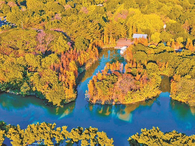 近日,广州海珠国家湿地公园内的落羽杉迎来了色彩最为浓郁的时刻。园内落羽杉变红进度已超过八成,大片棕红、焦糖色的枝叶层层浸染,犹如一幅徐徐展开的油画,为市民游客献上一场限定的冬季视觉盛宴。位于海珠湖区域的观鸟长廊,是观赏落羽杉全景的观赏点。长廊蜿蜒,杉树依水而生,视野极为开阔。欢迎市民游客在湖光林影间放松身心,感受自然之美。