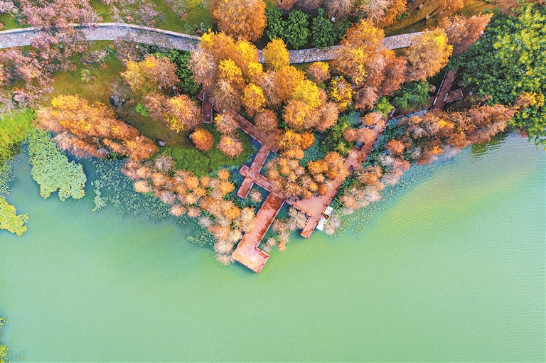 趁着晴好天气,不妨走进黄埔的公园,赴一场冬日限定的色彩之约。在凤凰湖公园,落羽杉沿湖岸整齐挺立,清澈湖面倒映出红杉倩影,与环湖木栈道相映成趣。九龙湖公园则以色彩层次丰富著称。焦糖色、枫叶橘、落日金交织,仿佛打翻的调色盘。原木色观景平台与橘红色杉林高度契合,游客可登高与树冠合影。创业公园呈现出静谧诗意之美,飞鸟掠过水面,搅动杉林与天空的倒影,幻化成流动的水彩画卷。创新公园运动广场旁的落羽杉历经四季流转,冬季沉淀为沉稳锈红,随手一拍即是限定大片。