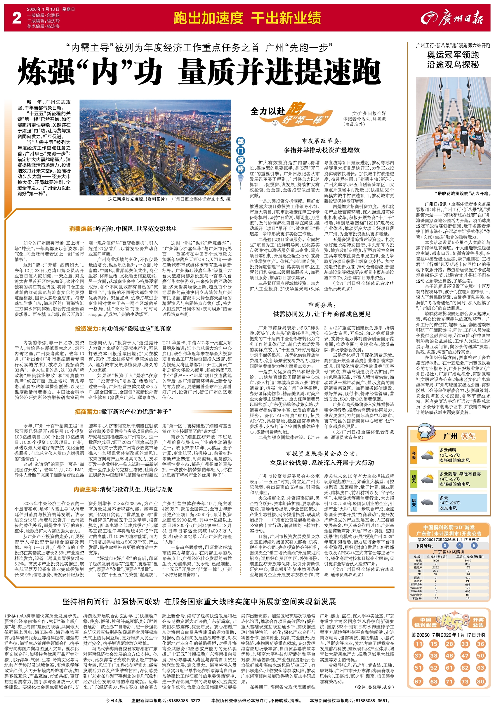 - 炼强“内”功 量质并进提速跑 全力以赴跑好“第一棒”① 新一年,广州矢志攻坚、千年商都气象日新。 “十五五”新征程的关键“第一程”已然开跑,如何能跑得更快更稳,关键还在于炼强“内”功,让消费与投资同向发力,相互促进。