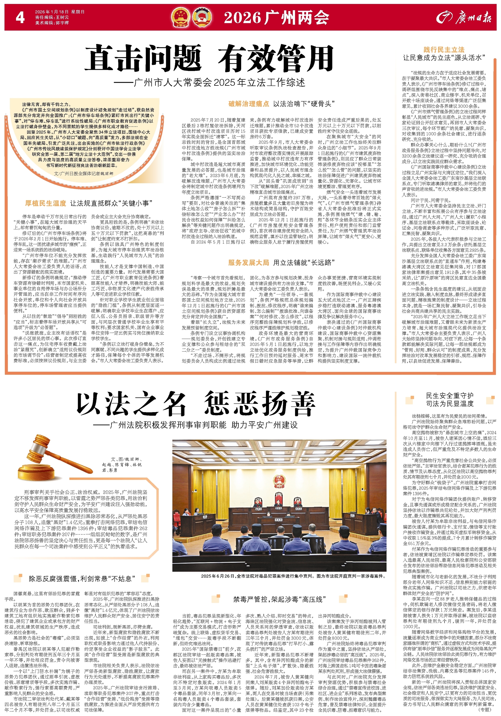 文、图/魏丽娜、赵越、陈育锦、林锐君、彭勇 刑事审判关乎社会公正、法治权威。2025年,广州法院坚定不移发挥刑事审判职能,以雷霆之势严惩各类犯罪,用法治利剑守护人民群众生命财产安全,为平安广州