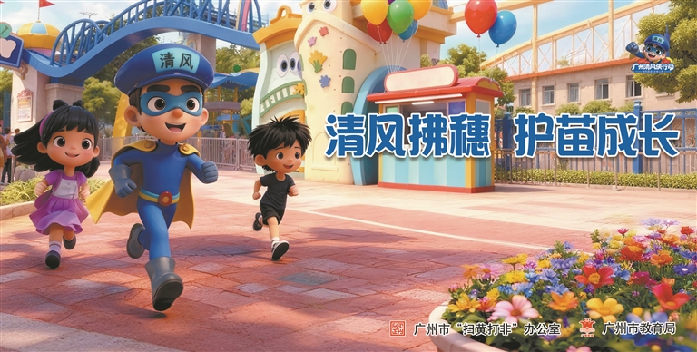广州日报讯 (全媒体记者黄岚 通讯员穗宣摄影报道)近日,广州市“扫黄打非”办公室联合市教育局推出“绿书签行动”宣传海报。该系列海报共5张,均以“清风侠”为核心视觉元素。海报中的“清风侠”身着标志性的蓝黄配色服装,或挥手致意,或赠予绿书签,或陪伴阅读,以亲切的形象与青少年互动。海报还巧妙融入五羊石像、广州塔、花城广场等地标元素,将“护苗”行动与城市文化深度融合。