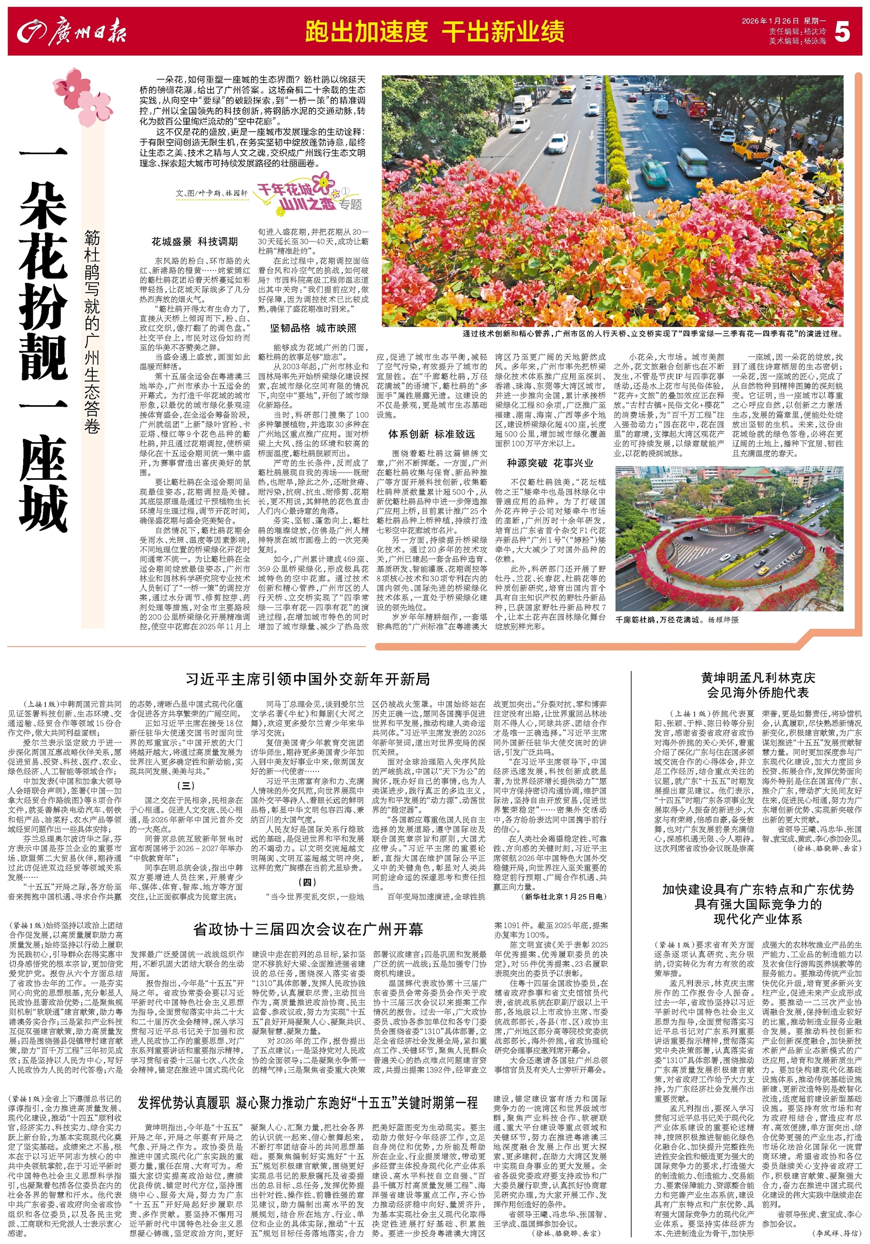 - 一朵花扮靓一座城 千年花城山川之恋专题① 一朵花,如何重塑一座城的生态界面?簕杜鹃以绵延天桥的磅礴花瀑,给出了广州答案。这场奋楫二十余载的生态实践,从向空中“要绿”的破题探索,到“一桥一策”的精准调控,广州以全