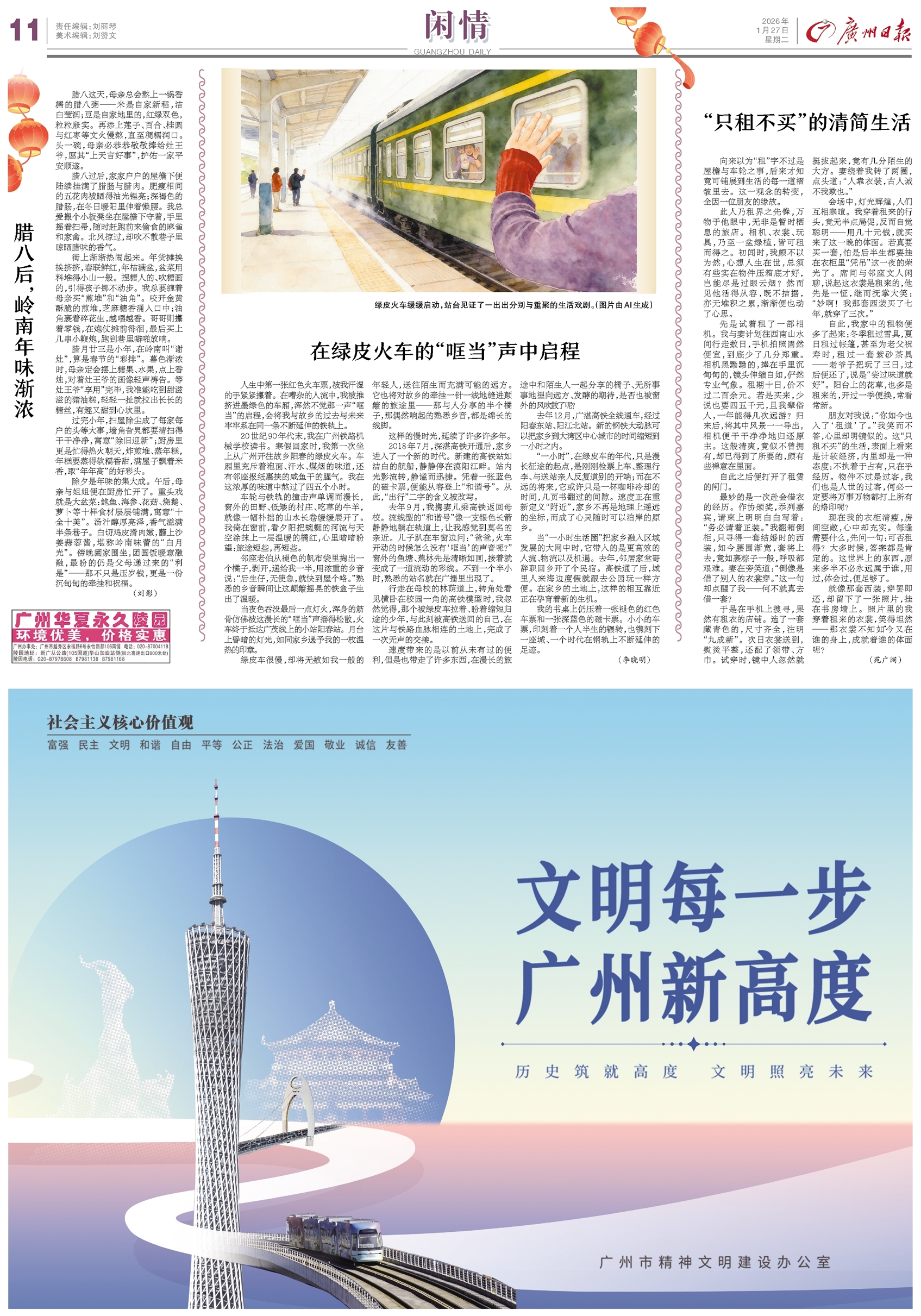 - 腊八后,岭南年味渐浓 腊八这天,母亲总会熬上一锅香糯的腊八粥——米是自家新稻,洁白莹润;豆是自家地里的,红绿双色,粒粒殷实。再添上莲子、百合、桂圆与红枣等文火慢熬,直至稠糯润口。头一碗,母亲必恭恭敬敬捧给灶王爷,愿其“